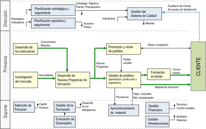 El primer paso para iniciar el cambio de mentalidad es comprender los procesos de la organización. Y para ello, nada mejor que dibujarlos y ponerles nombres. Al principio cuesta un poco porque estamos acostumbrados a pensar en departamentos. Con un poco de práctica, resultará natural ver la empresa como un conjunto de procesos conectados entre sí.